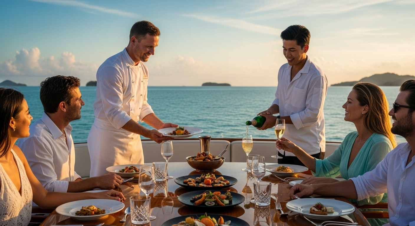 Savor exceptional cuisine wherever your travels take you, whether aboard private yachts or at exotic destinations. Our team ensures a flawless, personalized dining experience, combining creativity, precision, and meticulous attention to every detail for unforgettable moments.